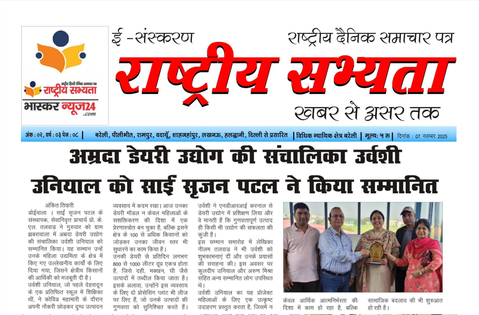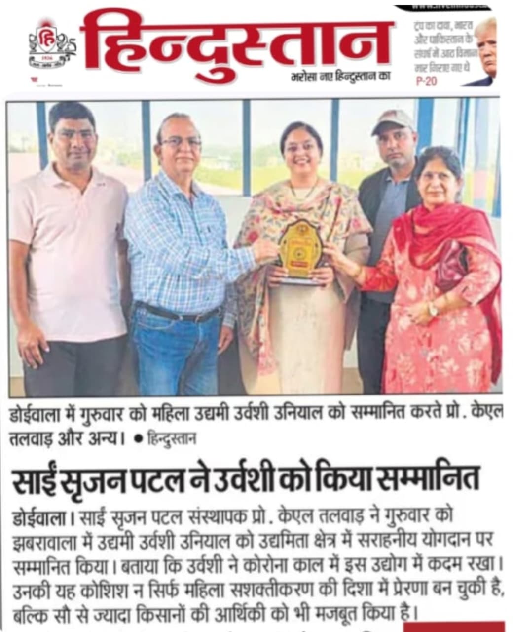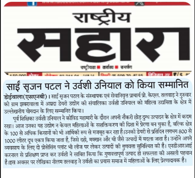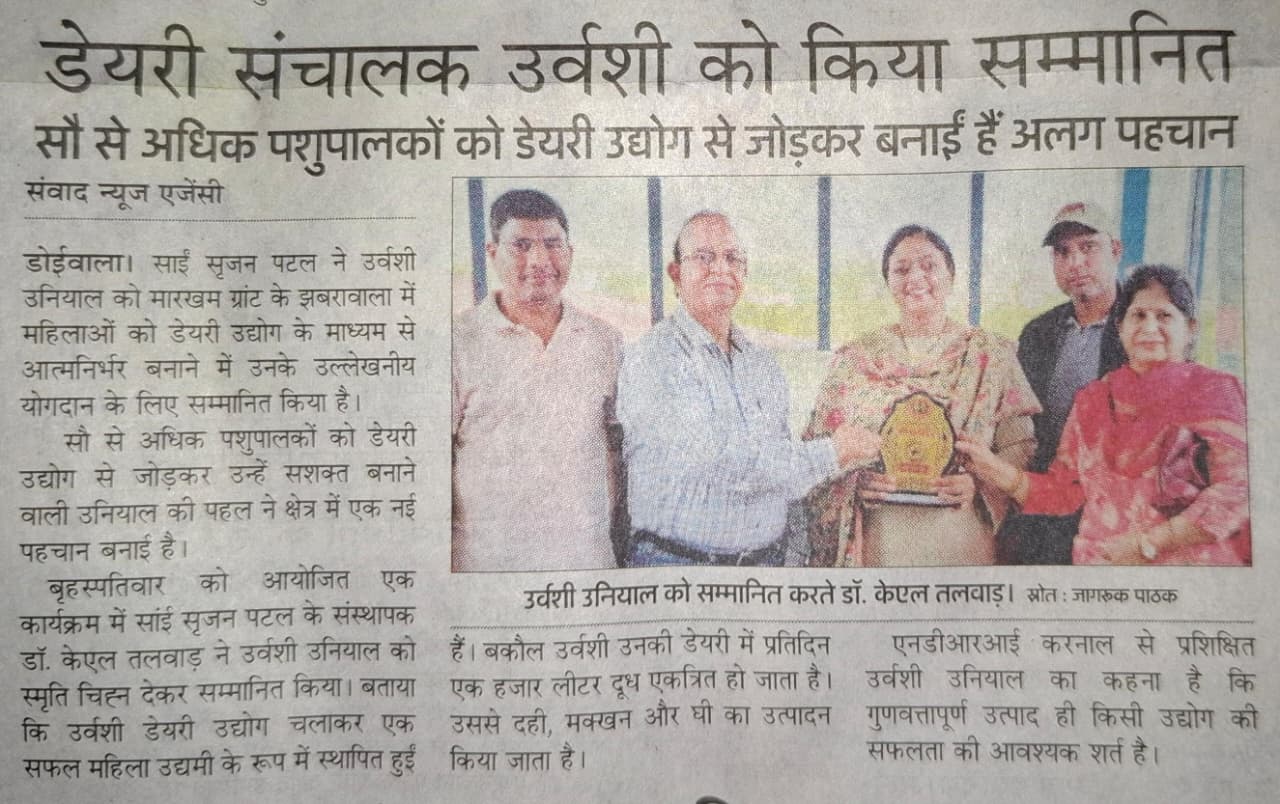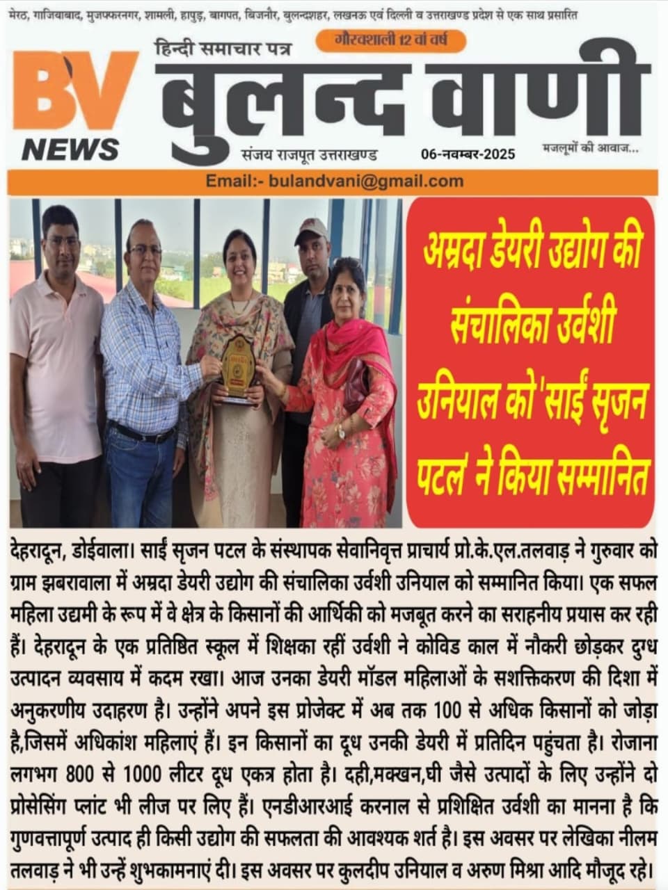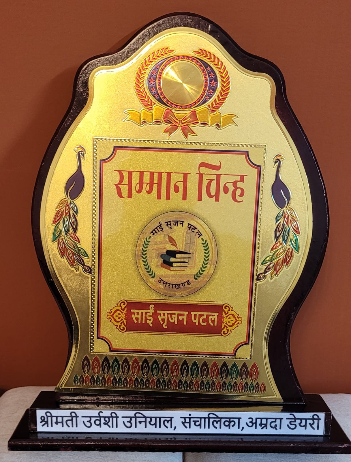 Awards / Certificates NDRI KARNALCertificate of training awarded at NDRI KARNAL Agricultural DepartmentBest Farmer Dairy awarded by Agricultural Department Dehradun NIFTEM SONIPATTraining at NIFTEM SONIPAT NIFTEM SonipatTraining at NIFTEM Sonipat NDRI KARNALCertificate given at NDRI KARNAL UDAYAN CARE ( NGO)Associated with UDAYAN CARE ( NGO) for girls education. Shared the stage with MD UJVNL Mr. Singhal and Principal Welham Girls’ School Mrs Vibha Kapoor and UDAYAN CARE president . RJ KavvyaAmrada Ghee gifted to RJ Kavvya PHD Chambers of Commerce New DelhiCertificate awarded for training at PHD Chambers of Commerce New Delhi Start Up HimalayaChosen among 25 promising entrepreneurs by Start Up Himalaya. Gifting ghee to VC Sir of NIFTEM Sonipat SAI SRAJAN PATELAmrada Products proudly receives an award presented by Sai Srajan Patal, recognizing its commitment to purity, quality, and excellence in dairy products. Amrada dairy Industry director Urvashi Uniyal was Honored by Sai Srijan Patel, news from Rashtriya Sabhyata Bhaskar News24. Amrda Dairy Industry director Urvashi Uniyal was honored by Sai Srijan Patel for empowering women and supporting farmers through her dairy project, which aids over 100 farmers and processes 800–1000 liters of milk daily. <This message was edited>